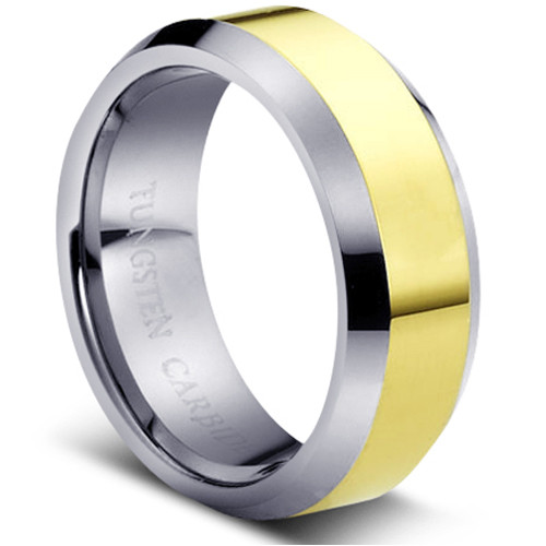 These classic 8mm wide Comfort Fit Tungsten Wedding Bands are made from high grade cobalt-free Tungsten Carbide. This band is made in the traditional domed design with yellow gold in the center and has a finely polished finish. This 8 mm wide Wedding Band is ideally suited for both men and women.